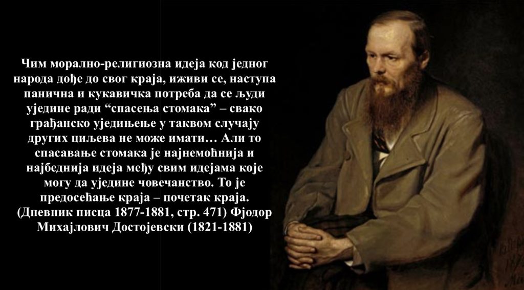 Анализирајући ове појаве, иако дубоко свестан да су оне само последица свеопште разградње света, никако узрок распада, помислио сам на легенду о Великом инквизитору и његовим поставкама у којима је хлеб најнеспорнија чињеница и вредност људског живота. А када се овоземаљски хлеб етаблира као највиша, животна вредност, онда човек губи способност да буде слободан. Такав човек губи понос, тежњу ка истинотрагању и постаје порочни роб овоземаљских страсти. Управо такви људи, потребни су инквизиторима Постмодерног света. То су они људи из безличног лонца за топљење, они серијски бројеви, артикли који гутају сваку лаж која им се пласира из Централне светске кухиње.