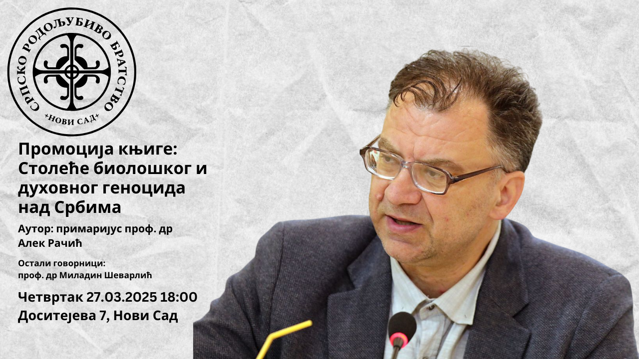 Промоција књиге: Столеће биолошког и духовног геноцида над Србима 22.03.2025. by Српско родољубиво братство Позивамо вас на промоцију књиге у четвртак 27.03.2025 18:00 на адреси удружења Доситејева 7, Нови Сад. Видимо се.