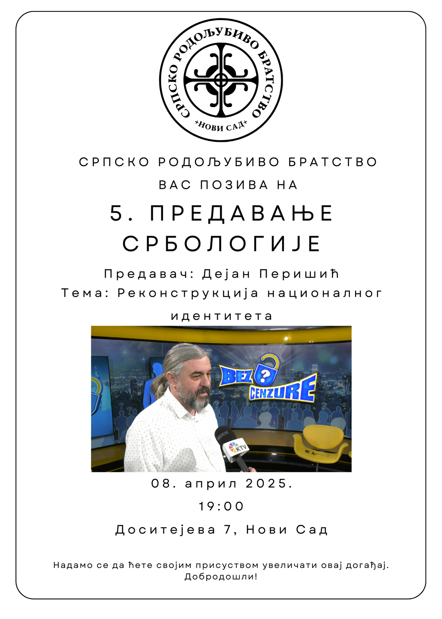 Српско родољубиво братство вас позива на предавање под именом: Србологија 5 – Србологија – 5. предавање – Реконструкција националног идентитета – најава.
